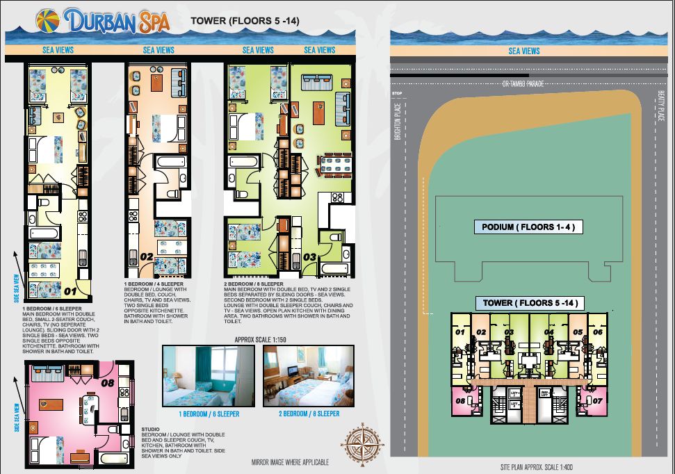 - A refundable key / breakage deposit is payable upon arrival at the resort, the amount can be confirmed by contacting the resort directly. Please note that should this fee not be paid, occupancy will not be granted. Please note that the Key and Breakage Fee is payable upon arrival to the Resort directly. This fee is not payable to the Reservation Company, as it is a Resort function. Please note: Various beaches across KZN have been closed due to poor E-Coli water quality. Please visit https://www.durban.gov.za/storage/PDF%20Documents/Beaches_Pools.pdf for an up to date list of the beaches affected. Please note that no pets are permitted. This includes all pets. Please Note: From 1 June 2022 the resort will be implementing a R250.00 linen change fee for split week reservations. Durban Spa's units are not wheelchair friendly although minor adjustments can be made to the 2 and 8 sleeper units - please call the resort prior to check-in to arrange this. Please note: Studio units are not full sea facing but has side sea views. Being on the side of the building, it is only partially sea facing. Group Bookings Notice: Please note that should you confirm 2 or more chalets at the same resort, for the same period, that this will be regarded as a Group Booking. Over and above the Standard Terms and Conditions and Resort Rules and Regulations, the below will also apply to all Group Bookings: 1. Before confirming and paying for your Group Booking (2 or more chalets at the same resort, for the same period), it is your responsibility to first contact the relevant Reservations Company to obtain approval from the relevant resort for the Group Booking. Should the resort decline the request for the Group Booking, the reservation will be canceled with immediate effect. Should the resort grant approval for the Group Booking, the relevant Reservations Group will assist with the payment and confirmation of the reservations, and all additional Group Booking Terms and Conditions will be explained. 2. Group Booking gatherings are not permitted in one chalet. No more than the prescribed number of guests per chalet will be permitted in the chalet. 3. Communal / Boma areas / facilities are available at most resorts. Please contact the resort directly after confirming the booking with the relevant Reservations Company, to book the areas for Group Bookings. Please do note that this will be at an additional cost and managed by the relevant resort. 4. No parties / loud music / disruptive / abusive behavior will be tolerated. Non-compliance will lead to immediate eviction at Managements and / or Security’s sole discretion. This decision is final, and the Group will be requested to leave the resort immediately. Should the Group be evicted from the resort, or occupation not permitted, neither the Reservations Company, the Resort, nor the Managing Agent will be liable for any form of compensation / refund. 5. Additional Group Booking forms must be signed by the main member upon arrival at the resort. Should the main member fail to sign the said indemnities, access will be denied, with no compensation / refund given. 6. The Key and Breakage deposit is payable per chalet confirmed, and not per Group.