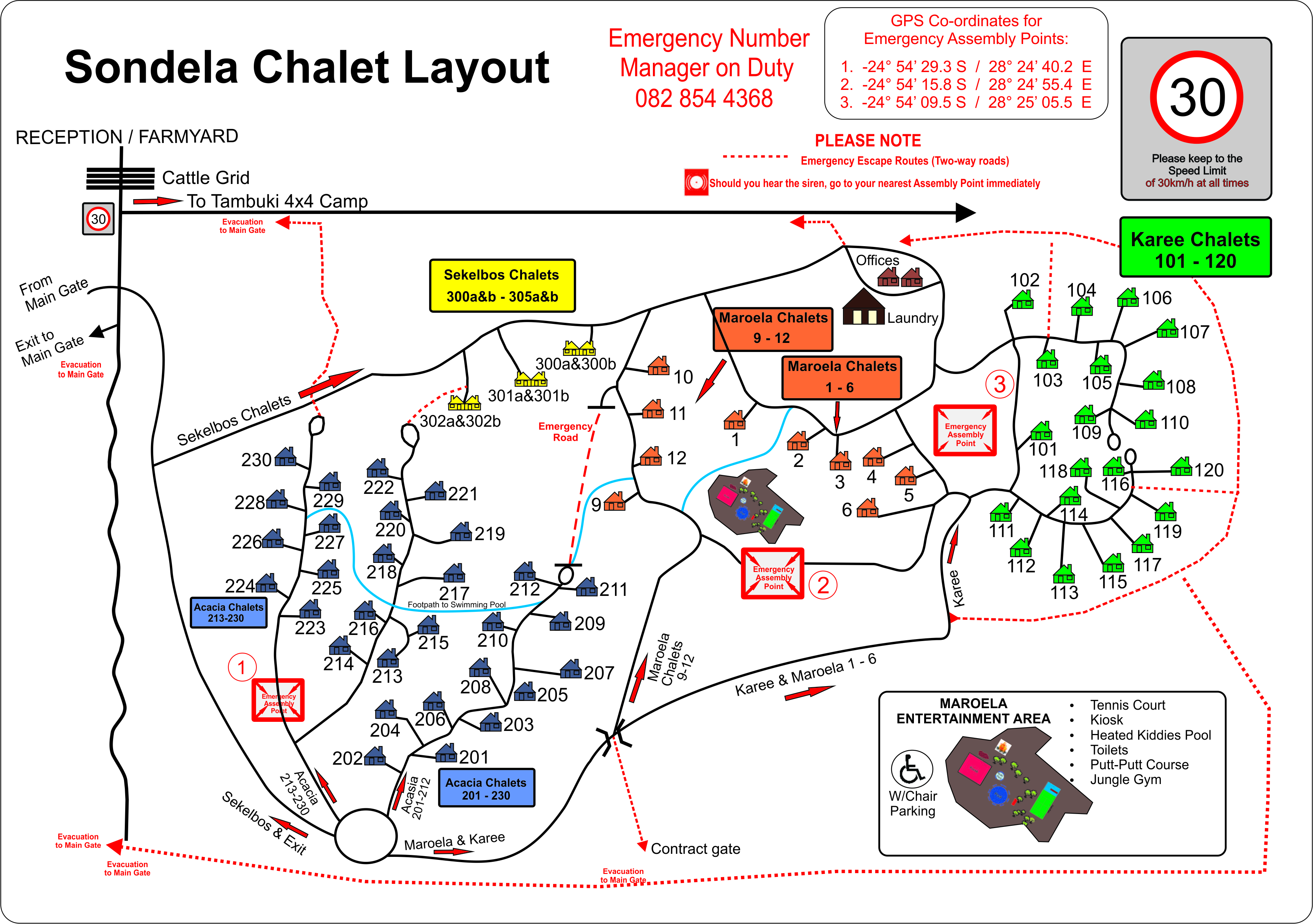 - A refundable key / breakage deposit is payable upon arrival at the resort, the amount can be confirmed by contacting the resort directly. Please note that should this fee not be paid, occupancy will not be granted. Please note that the Key and Breakage Fee is payable upon arrival to the Resort directly. This fee is not payable to the Reservation Company, as it is a Resort function. Please note that no pets are permitted. This includes all pets. Day Visitors: In order to promote the privacy of resident guests, NO DAY VISITORS will be allowed on the Resort. NB: Please note that NO MOTORCYCLES are allowed on the Lodge. Dirt landing strip 820m. GPS coordinates: 24° 54' 252" S 28° 23' 886" E NB! Advance notice must be given for landing. Please send notification 72 hours prior to landing to info@sondela.com. Ensure confirmation of your notification is received prior to landing. Emergency telephone number: 082 854 4368. Babysitting (at night only - please arrange 48 hours in advance). Credit card facilities at General Dealer. Piccinini's Bistro, Caravan Park and Reception. Laundry service at extra cost. DSTV at Maroela Lapa and Premier Lapa (at the Caravan Park). Conference facilities: +27 14 736 8914 (Nadine Scholtz). Email: conferences@sondela.com Iketla Wellness and Spa: Tel: +27 (0) 14 736 8809. Email: iketla@sondela.com All units have had inverters installed, which will alleviate load shedding whilst in your unit. Please contact the resort for further information. Group Bookings Notice: Please note that should you confirm 2 or more chalets at the same resort, for the same period, that this will be regarded as a Group Booking. Over and above the Standard Terms and Conditions and Resort Rules and Regulations, the below will also apply to all Group Bookings: 1. Before confirming and paying for your Group Booking (2 or more chalets at the same resort, for the same period), it is your responsibility to first contact the relevant Reservations Company to obtain approval from the relevant resort for the Group Booking. Should the resort decline the request for the Group Booking, the reservation will be canceled with immediate effect. Should the resort grant approval for the Group Booking, the relevant Reservations Group will assist with the payment and confirmation of the reservations, and all additional Group Booking Terms and Conditions will be explained. 2. Group Booking gatherings are not permitted in one chalet. No more than the prescribed number of guests per chalet will be permitted in the chalet. 3. Communal / Boma areas / facilities are available at most resorts. Please contact the resort directly after confirming the booking with the relevant Reservations Company, to book the areas for Group Bookings. Please do note that this will be at an additional cost and managed by the relevant resort. 4. No parties / loud music / disruptive / abusive behavior will be tolerated. Non-compliance will lead to immediate eviction at Managements and / or Security’s sole discretion. This decision is final, and the Group will be requested to leave the resort immediately. Should the Group be evicted from the resort, or occupation not permitted, neither the Reservations Company, the Resort, nor the Managing Agent will be liable for any form of compensation / refund. 5. Additional Group Booking forms must be signed by the main member upon arrival at the resort. Should the main member fail to sign the said indemnities, access will be denied, with no compensation / refund given. 6. The Key and Breakage deposit is payable per chalet confirmed, and not per Group.